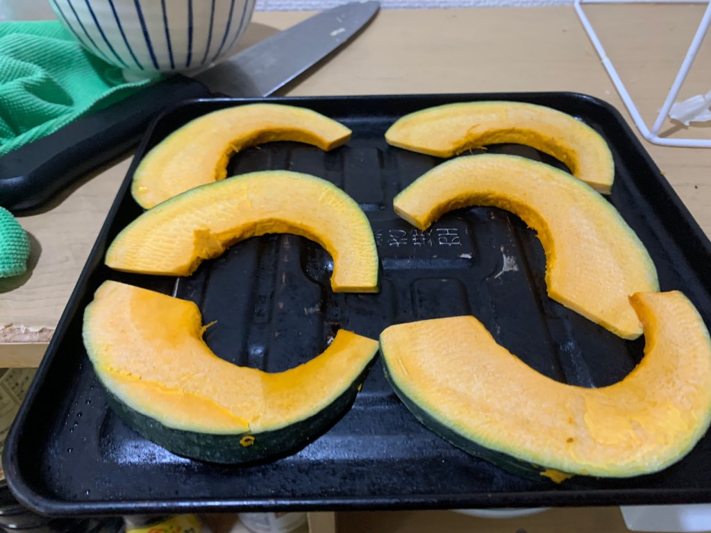 1. Cut your squash up into half moon slices. I actually purchased them pre-cut since it’s cheaper for me in Tokyo. This style of slice allows for more even caramelizing.